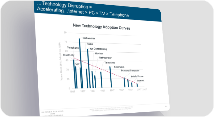 …Technology Disruption = Accelerating…Internet > PC > TV > Telephone New Technology Adoption Curves 90 Dishwasher 75 Radio USA Telephone Air Conditioning 60 ion, Washer Electricity Refrigerator dopt A 45 % Television 5 Car Microwave til 2 30 Personal Computer Un rs a Mobile Phone e 15 Y Internet 0 1867 1887 1907 1927 1947 1967 1987 2007 2017 Source: The Economist (12/15), Pew Research Center (1/17), Asymco (11/13). Note: Starting years based on invention year of each consumer product. 144