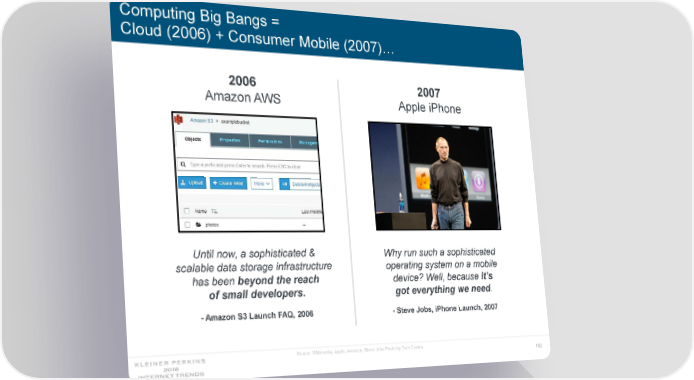 Computing Big Bangs = Cloud (2006) + Consumer Mobile (2007)… 2006 2007 Amazon AWS Apple iPhone Until now, a sophisticated & Why run such a sophisticated scalable data storage infrastructure operating system on a mobile has been beyond the reach device? Well, because it’s of small developers. got everything we need. - Amazon S3 Launch FAQ, 2006 - Steve Jobs, iPhone Launch, 2007 Source: Wikimedia, Apple, Amazon, Steve Jobs Photo by Tom Coates. 182