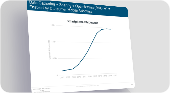 Data Gathering + Sharing + Optimization (2006 ) = Enabled by Consumer Mobile Adoption... Smartphone Shipments 1.5B 1.0B nts me Ship al lob 0.5B G 0 2007 2008 2009 2010 2011 2012 2013 2014 2015 2016 2017 Source: Morgan Stanley (Katy Huberty, 3/18), IDC. 186