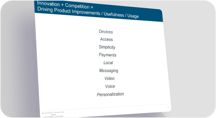 Internet Trends 2018 Page 13 Page 15Innovation + Competition = Driving Product Improvements / Usefulness / Usage Devices Access Simplicity Payments Local Messaging Video Voice Personalization 14
