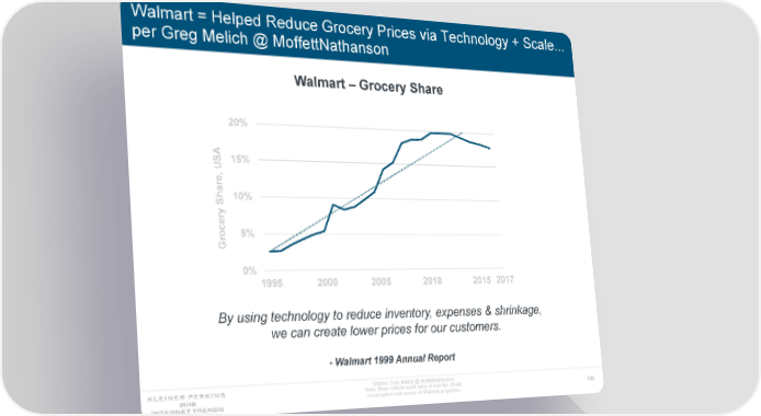Walmart = Helped Reduce Grocery Prices via Technology + Scale... per Greg Melich @ MoffettNathanson Walmart – Grocery Share 20% SA15% U e, ar 10% Sh y cer o 5% Gr 0% 1995 2000 2005 2010 2015 2017 By using technology to reduce inventory, expenses & shrinkage, we can create lower prices for our customers. - Walmart 1999 Annual Report Source: Greg Melich @ MoffettNathanson Note: Share reflects retail value of food for off-site 109 consumption sold across all Walmart properties.