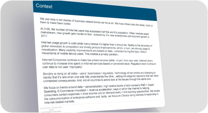 Context We use data to tell stories of business-related trends we focus on. We hope others take the ideas, build on them & make them better. At 3.6B, the number of Internet users has surpassed half the world’s population. When markets reach mainstream, new growth gets harder to find - evinced by 0% new smartphone unit shipment growth in 2017. Internet usage growth is solid while many believe it’s higher than it should be. Reality is the dynamics of global innovation & competition are driving product improvements, which, in turn, are driving usage & monetization. Many usability improvements are based on data - collected during the taps / clicks / movements of mobile device users. This creates a privacy paradox... Internet Companies continue to make low-priced services better, in part, from user data. Internet Users continue to increase time spent on Internet services based on perceived value. Regulators want to ensure user data is not used ‘improperly.’ Scrutiny is rising on all sides - users / businesses / regulators. Technology-driven trends are changing so rapidly that it’s rare when one side fully understands the other...setting the stage for reactions that can have unintended consequences. And, not all countries & actors look at the issues through the same lens. We focus on trends around data + personalization; high relative levels of tech company R&D + Capex Spending; E-Commerce innovation + revenue acceleration; ways in which the Internet is helping consumers contain expenses + drive income (via on-demand work) + find learning opportunities. We review the consumerization of enterprise software and, lastly, we focus on China’s rising intensity & leadership in Internet-related markets. 3