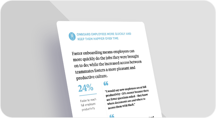 ONBOARD EMPLOYEES MORE QUICKLY AND KEEP THEM HAPPIER OVER TIME Faster onboarding means employees can more quickly do the jobs they were brought on to do; while the increased access between teammates fosters a more pleasant and productive culture. 24% “I would say new employees are at full Faster to reach productivity ~25% sooner because there full employee are fewer questions asked – they know productivity where documents are and where to access them with Slack.” “You can very quickly get up-to-speed and there’s a lot of stuff in Slack that you can look for as a new employee. It’s incredibly helpful for not starting at zero.” 10% “Slack really helps to facilitate culture at Improvement the company… and allows everybody who in employee needs to be involved to be collaborating satisfaction and accessible.” Excerpted from IDC research, sponsored by Slack, The Business Value of Slack, 2017 THE BUSINESS VALUE OF SLACK FOR HR 14