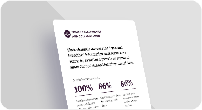 FOSTER TRANSPARENCY AND COLLABORATION Slack channels increase the depth and breadth of information sales teams have access to, as well as a provide an avenue to share out updates and learnings in real time. Of sales leaders surveyed... 100% 86% 86% Find Slack helps them Say it’s easier to share Say Slack gives better collaborate key learnings with them better access with non-sales teams Slack to information in the field “Slack has helped promote information sharing across our sales verticals, as well as generally increase access to knowledge across our business.” Excerpted from IDC research, sponsored by Slack, The Business Value of Slack, 2017 THE BUSINESS VALUE OF SLACK FOR SALES 7