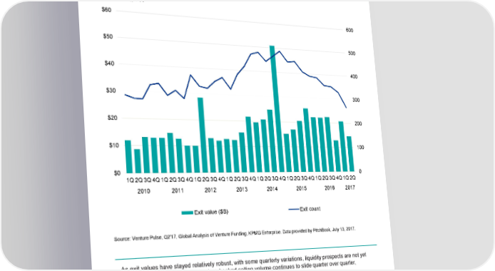 Global venture-backed exit activity 2010 — Q2'17 $60 600 $50 500 $40 400 $30 300 $20 200 $10 100 $0 0 1Q2Q3Q4Q1Q2Q3Q4Q1Q2Q3Q4Q1Q2Q3Q4Q1Q2Q3Q4Q1Q2Q3Q4Q1Q2Q3Q4Q1Q2Q 2010 2011 2012 2013 2014 2015 2016 2017 Exit value ($B) Exit count Source: Venture Pulse, Q2'17, Global Analysis of Venture Funding, KPMG Enterprise. Data provided by PitchBook, July 13, 2017. As exit values have stayed relatively robust, with some quarterly variations, liquidity prospects are not yet overly troubling. However, as venture-backed selling volume continues to slide quarter over quarter, investors with aging holdings are likely to grow more attuned to exit opportunities. © 2017 KPMG International Cooperative (“KPMG International”). KPMG International provides no client services and is a Swiss entity with which the independent member firms of the KPMG network are affiliated. #Q2VC