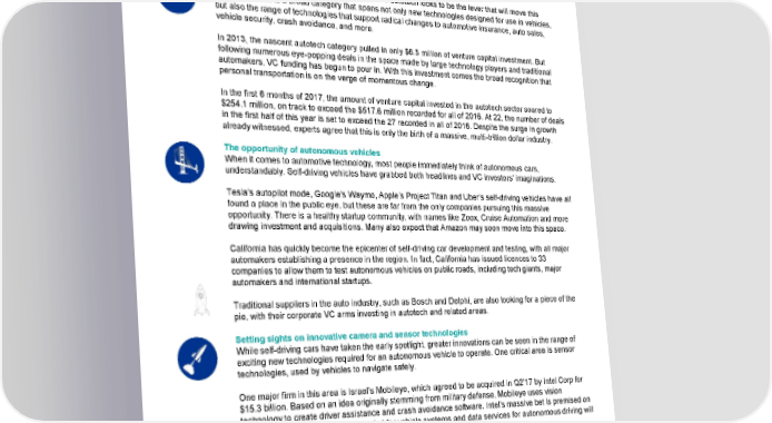 The automotive industry is ripe for disruption, and autotech looks to be the lever that will move this world. Autotech is a broad category that spans not only new technologies designed for use in vehicles, but also the range of technologies that support radical changes to automotive insurance, auto sales, vehicle security, crash avoidance, and more. In 2013, the nascent autotech category pulled in only $6.5 million of venture capital investment. But following numerous eye-popping deals in the space made by large technology players and traditional automakers, VC funding has begun to pour in. With this investment comes the broad recognition that personal transportation is on the verge of momentous change. In the first 6 months of 2017, the amount of venture capital invested in the autotech sector soared to $254.1 million, on track to exceed the $517.6 million recorded for all of 2016. At 22, the number of deals in the first half of this year is set to exceed the 27 recorded in all of 2016. Despite the surge in growth already witnessed, experts agree that this is only the birth of a massive, multi-trillion dollar industry. The opportunity of autonomous vehicles When it comes to automotive technology, most people immediately think of autonomous cars, understandably. Self-driving vehicles have grabbed both headlines and VC investors’ imaginations. Tesla’s autopilot mode, Google’s Waymo, Apple’s Project Titan and Uber’s self-driving vehicles have all found a place in the public eye, but these are far from the only companies pursuing this massive opportunity. There is a healthy startup community, with names like Zoox, Cruise Automation and more drawing investment and acquisitions. Many also expect that Amazon may soon move into this space. California has quickly become the epicenter of self-driving car development and testing, with all major automakers establishing a presence in the region. In fact, California has issued licences to 33 companies to allow them to test autonomous vehicles on public roads, including tech giants, major automakers and international startups. Traditional suppliers in the auto industry, such as Bosch and Delphi, are also looking for a piece of the pie, with their corporate VC arms investing in autotech and related areas. Setting sights on innovative camera and sensor technologies While self-driving cars have taken the early spotlight, greater innovations can be seen in the range of exciting new technologies required for an autonomous vehicle to operate. One critical area is sensor technologies, used by vehicles to navigate safely. One major firm in this area is Israel’s Mobileye, which agreed to be acquired in Q2’17 by Intel Corp for $15.3 billion. Based on an idea originally stemming from military defense, Mobileye uses vision technology to create driver assistance and crash avoidance software. Intel’s massive bet is premised on the company’s forecast that the market for vehicle systems and data services for autonomous driving will be worth $70 billion by 2030. Other sensing technologies making waves include ultrasonic sensors, which use sound waves to identify nearby obstacles and LIDAR, which uses lasers to measure distances and create a 3D map of surrounding objects. © 2017 KPMG International Cooperative (“KPMG International”). KPMG International provides no client services and is a Swiss entity with which the independent member firms of the KPMG network are affiliated. #Q2VC
