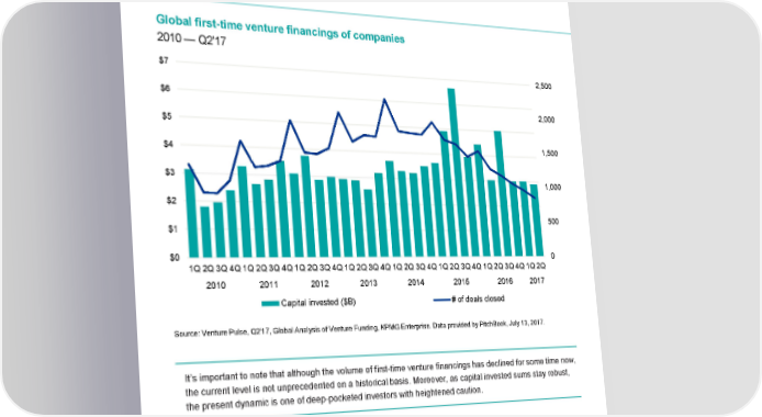 Global first-time venture financings of companies 2010 — Q2'17 $7 2,500 $6 2,000 $5 1,500 $4 $3 1,000 $2 500 $1 $0 0 1Q2Q3Q4Q1Q2Q3Q4Q1Q2Q3Q4Q1Q2Q3Q4Q1Q2Q3Q4Q1Q2Q3Q4Q1Q2Q3Q4Q1Q2Q 2010 2011 2012 2013 2014 2015 2016 2017 Capital invested ($B) # of deals closed Source: Venture Pulse, Q2'17, Global Analysis of Venture Funding, KPMG Enterprise. Data provided by PitchBook, July 13, 2017. It’s important to note that although the volume of first-time venture financings has declined for some time now, the current level is not unprecedented on a historical basis. Moreover, as capital invested sums stay robust, the present dynamic is one of deep-pocketed investors with heightened caution. © 2017 KPMG International Cooperative (“KPMG International”). KPMG International provides no client services and is a Swiss entity with which the independent member firms of the KPMG network are affiliated. #Q2VC