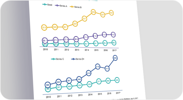 Global median pre-money valuation ($M) by series 2010 — H1'17 Seed Series A Series B $40 $39 $37 $31 $25 $21 $20 $19 $15.0 $14.6 $12.8 $11.0 $8.6 $7.9 $7.0 $6.1 $6.0 $5.4 $4.7 $4.1 $3.5 $3.7 $3.6 $3.0 2010 2011 2012 2013 2014 2015 2016 2017* $260 Series C Series D+ $192 $175 $143 $98 $91 $84 $83 $80 $77 $66 $58 $54 $49 $47 $38 2010 2011 2012 2013 2014 2015 2016 2017* Source: Venture Pulse, Q2'17, Global Analysis of Venture Funding, KPMG Enterprise. *As of 6/30/2017. Data provided by PitchBook, July 13, 2017. The dramatic upward surge in median pre-money valuations at the latest stage is primarily driven by the most successful of the crop of startups founded post-financial crisis reaching full maturity and raking in potentially one final growth-stage round, or midstage businesses raising capital in a play at dominance, for example, Didi Chuxing. © 2017 KPMG International Cooperative (“KPMG International”). KPMG International provides no client services and is a Swiss entity with which the independent member firms of the KPMG network are affiliated. #Q2VC