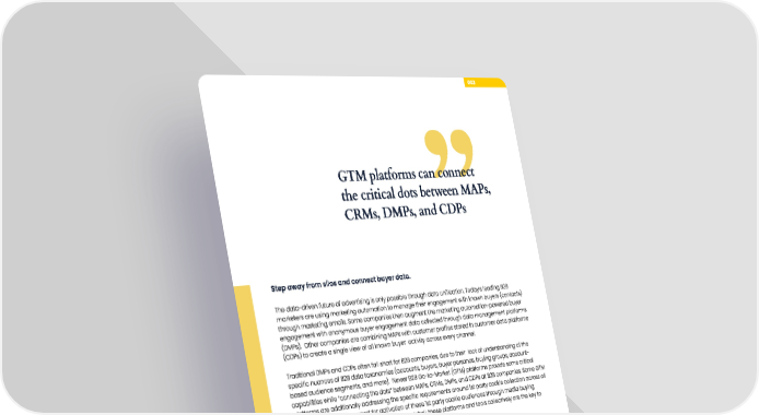 003 GGTTMM ppllaattffoorrmmss ccaann ccoonnnneecctt tthhee ccrriittiiccaall ddoottss bbeettwweeeenn MMAAPPss,, CCRRMMss,, DDMMPPss,, aanndd CCDDPPss ” Step away from silos and connect buyer data. The data-driven future of advertising is only possible through data unification. Today’s leading B2B marketers are using marketing automation to manage their engagement with known buyers (contacts) through marketing emails. Some companies then augment the marketing automation-powered buyer engagement with anonymous buyer engagement data collected through data management platforms (DMPs). Other companies are combining MAPs with customer profiles stored in customer data platforms (CDPs) to create a single view of all known buyer activity across every channel. Traditional DMPs and CDPs often fall short for B2B companies, due to their lack of understanding of the specific nuances of B2B data taxonomies (accounts, buyers, buyer personas, buying groups, account- based audience segments, and more). Newer B2B Go-to-Market (GTM) platforms provide some critical capabilities while “connecting the dots” between MAPs, CRMs, DMPs, and CDPs at B2B companies. Some GTM platforms are additionally addressing the specific requirements around 1st party cookie collection across all online channels, with support for activation of these 1st party cookie audiences through media buying platforms (DSPs) of programmatic ads. In a nutshell, these platforms and tools collectively are the key to data-driven advertising at global scale. To start unifying data sources, it’s important for marketers to work with other departments such as sales and customer success to evaluate all relevant data across the company. You may even need to reach out to outside agencies and partners to get a handle on all your past customer interactions. Once you know where your data is, it’s just a matter of accurately organizing and uploading it to your B2B GTM, DMP and CDP platforms. With dedicated oversight and a little help from B2B GTM experts who also truly understand your GTM and data strategy, you’ll be ready to use unified data to build connected customer experiences before you know it. Lay a data foundation. Successfully connecting your target account, prospect and customer data starts with a clear strategy. This means you need to start with a plan and decide what kind of data you need, how you want to segment your audiences, and how you want to use data to personalize your buyer engagement.When your strategy includes detailed planning on these points, you’ll have a clear understanding of how to proceed once you start gathering prospect and customer data in a unified platform. Kwanzoo
