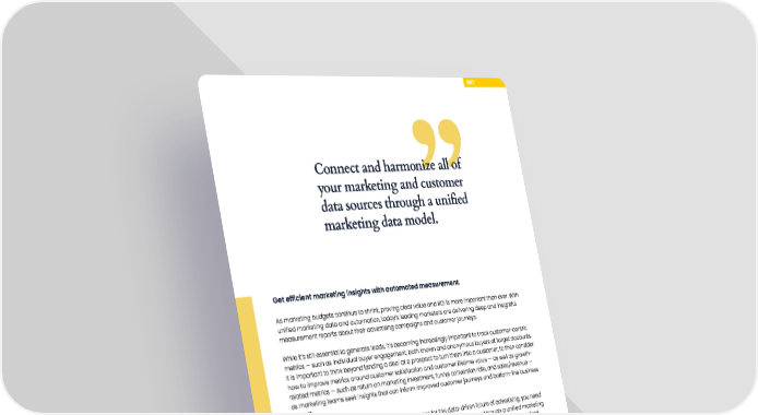 007 CCoonnnneecctt aanndd hhaarrmmoonniizzee aallll ooff yyoouurr mmaarrkkeettiinngg aanndd ccuussttoommeerr ddaattaa ssoouurrcceess tthhrroouugghh aa uunniiffiieedd mmaarrkkeettiinngg ddaattaa mmooddeell.. ” Get efficient marketing insights with automated measurement. As marketing budgets continue to shrink, proving clear value and ROI is more important than ever. With unified marketing data and automation, today’s leading marketers are delivering deep and insightful measurement reports about their advertising campaigns and customer journeys. While it’s still essential to generate leads, it’s becoming increasingly important to track customer-centric metrics — such as individual buyer engagement, both known and anonymous buyers at target accounts. It is important to think beyond landing a deal at a prospect to turn them into a customer, to then consider how to improve metrics around customer satisfaction and customer lifetime value — as well as growth- related metrics — such as return on marketing investment, funnel conversion rate, and sales/revenue — as marketing teams seek insights that can inform improved customer journeys and bottom-line business impact. To prepare your measurement and reporting process for the data-driven future of advertising, you need to connect and harmonize all of your marketing and customer data sources through a unified marketing data model that adapts to any new campaign or channel. A key best practice is to create a standard marketing data taxonomy that you can scale across different business units, regions, and teams. This helps keep the reporting conversation consistent, no matter where it takes place. While artificial intelligence and automation promise to streamline measurement and gain real-time insights, modern marketing requires the best practices insights and human intelligence of strategists within your team, or at your marketing services partners. By evaluating your business goals and your target buyers’ needs, you can better align marketing to business outcomes. By using data as a starting point, you can help create a culture of continuous marketing optimization that benefits both your customers and your quarterly reports. Always find ways to improve. Fundamentally, data is information — and information is insight. Be sure to consistently use your marketing data to see how your advertising is working, and keep track of which parts of your campaign are working well and which parts may not be as successful.With an eye on continuous improvement, you can find ways to create truly compelling and personalized customer campaigns that evolve over time, powered by real-time updates based on your data. Kwanzoo