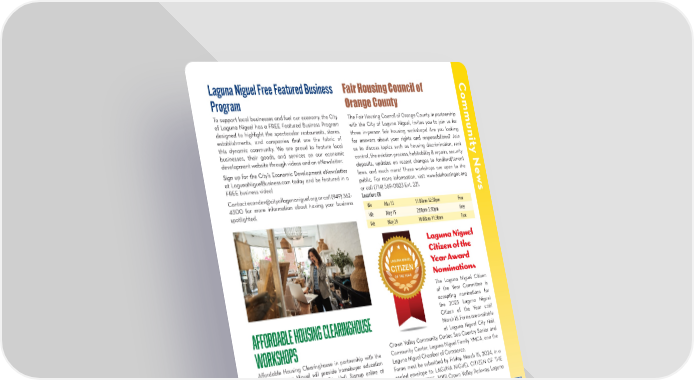 Laguna Niguel Free Featured Business Fair Housing Council of C Program Orange County ommunity N To support local businesses and fuel our economy, the City The Fair Housing Council of Orange County, in partnership of Laguna Niguel has a FREE Featured Business Program with the City of Laguna Niguel, invites you to join us for designed to highlight the spectacular restaurants, stores, three in-person fair housing workshops! Are you looking establishments, and companies that are the fabric of for answers about your rights and responsibilities? Join this dynamic community. We are proud to feature local us to discuss topics such as housing discrimination, rent businesses, their goods, and services on our economic control, the eviction process, habitability & repairs, security development website through videos and an eNewsletter. deposits, updates on recent changes to landlord/tenant Sign up for the City’s Economic Development eNewsletter laws, and much more! These workshops are open to the at LagunaNiguelBusiness.com today and be featured in a public. For more information, visit www.fairhousingoc.org e FREE business video! or call (714) 569-0823 Ext. 221. w Contact econdev@cityo昀氀agunaniguel.org or call (949) 362- Location: CH s 4300 for more information about having your business We Mar 13 11:00am-12:30pm Free spotlighted. We May 15 2:00pm-3:30pm Free We May 29 10:00am-11:30am Free Laguna Niguel Citizen of the LAGUNA NIGUEL Year Award CITIZEN Nominations OF THE YEAR The Laguna Niguel Citizen of the Year Committee is accepting nominations for the 2023 Laguna Niguel AFFORDABLE HOUSING CLEARINGHOUSE Citizen of the Year until March 15. Forms are available WORKSHOPS at Laguna Niguel City Hall, Crown Valley Community Center, Sea Country Senior and A昀昀ordable Housing Clearinghouse in partnership with the Community Center, Laguna Niguel Family YMCA, and the City of Laguna Niguel will provide homebuyer education Laguna Niguel Chamber of Commerce. workshops at Laguna Niguel City Hall. Signup online at Forms must be submitted by Friday, March 15, 2024, in a Eventbrite.com sealed envelope to: LAGUNA NIGUEL CITIZEN OF THE Credit & Budgeting Workshop YEAR COMMITTEE, 30111 Crown Valley Parkway, Laguna Participants will learn how to order their credit report at no Niguel, California 92677. cost, correct errors, receive helpful tips on how to repair past For questions, call Solveig Darner at (949) 495-1438. credit problems and establish a good credit history. Location: CH Th May 9 6:00pm-7:30pm Free Homebuyer Orientation This workshop is designed to help you get started on your journey towards homeownership. We will discuss the steps to homeownership and down payment assistance programs and resources. Location: CH Th May 16 6:00pm-7:30pm Free PARKS & RECREATION OFFICE: (949) 425-5100 | ONLINE REGISTRATION: CityofLagunaNiguel.org/Registration REGISTRATION FORM: Page 32 5