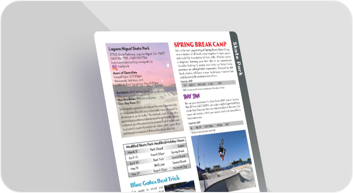 Laguna Niguel Skate Park SPRING BREAK CAMP Sk 27745 Alicia Parkway, Laguna Niguel, CA 92677 Join us for our Laguna Niguel Spring Break Skate Camp at where skaters of all levels come together to learn, grow, (949) 916-7755 • (949) 916-7766 and push the boundaries of their skills. Whether you're e P lnskatepark@cityo昀氀agunaniguel.org a beginner learning your 昀椀rst ollie or an experienced lnsk8park shredder looking to master new tricks, our Skate Camp Hours of Operation: promises an unforgettable experience. Grouped by skill ark School Days: 12-9:30pm level, skaters will learn proper techniques, improve their Weekends, Holidays, and skateboard skills and have tons of fun. CUSD School Vacations: 9am-9:30pm Location: LNSP Tu-F April 2-5 9am-12pm 3-13yrs $195* Residents: $40 annual pass* *$10 insurance fee due to instructor 昀椀rst day of class *Requires proof of residency Non-Residents: $80 annual pass BMX Jam One Day Pass: $10 The Skatepark is supervised by the Parks and Recreation Department. Daily Rev up your excitement for Blue Gates BMX Jam on Sunday, or annual passes, along with an up-to-date liability waiver, are required for May 19 from 5:30-7:30PM. Join us for a night of gravity-defying all individuals to use the facility. If the individual is under 18 years old, a stunts that showcase the most talented riders in the area. Our parent or legal guardian must either be present to sign the liability waiver or event will include a BMX jam session, best trick competitions, a notarized copy of the waiver must be presented. Proof of residency must food and prizes. be provided to acquire the resident rate. Helmets, plastic capped elbow, Location: LNSP and knee pads are required at all times while inside the Skate Park. Su May 19 5:30-7:30pm All Ages Free* * Daily or annual pass required Modi昀椀ed Skate Park Modi昀椀ed/Holiday Hours March 31 Park Closed Easter April 1-5 9am-9:30pm Spring Break April 20 Best Trick Special Event May 19 BMX Jam Special Event May 27 9am-9:30pm Memorial Day Blue Gates Best Trick Get ready to shred and showcase your sickest moves at our annual Best Trick Skateboard Contest. Join the Blue Gates community of fearless BMX Sessions skaters April 20th from 12-4pm for an adrenaline- Laguna Niguel Skate Park welcomes BMX and Dirt Jump/ packed day of 昀氀ips, grinds, Park speci昀椀c bikes to the skate park. We have 3 weekly “BMX and tricks. This event sessions” where the park is exclusive to BMX and dirt jump/ includes best trick contests park speci昀椀c bikes. Skateboarding and inline skating is not on various obstacles in permitted during these sessions. All riders must have a liability the skate park. There will waiver signed by a parent/guardian prior to entering the park be many opportunities to and must wear elbow pads, knee pads, and a helmet. Contact win amazing prizes! Event activities include games, food, the park at (949) 916-7755 or visit CityofLagunaNiguel.org prizes, giveaways, and ra昀툀es. for a list of rules and regulations pertaining to the use of BMX bikes at the facility. Location: LNSP Tuesday: 7-9:30pm | Friday: 12-4:30pm | Sunday: 4:30-9:30pm Sa April 20 12-4pm $20 pass holders/ $30 non-pass holders SKATE PARK: (949) 916-7755 | ONLINE REGISTRATION: CityofLagunaNiguel.org/Registration REGISTRATION FORM: Page 32 15