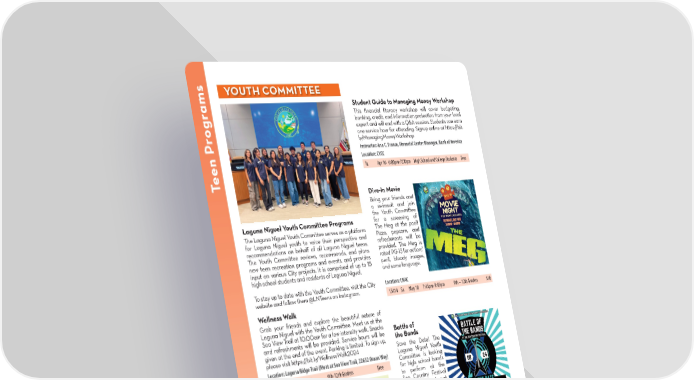 YOUTH COMMITTEE ams Student Guide to Managing Money Workshop This 昀椀nancial literacy workshop will cover budgeting, banking, credit, and information protection from your local ogr expert and will end with a Q&A session. Students can earn one service hour for attending. Signup online at https://bit. ly/ManagingMoneyWorkshop Instructor: Ana C. Franco, Financial Center Manager, Bank of America Location: CVCC een Pr Tu Apr 16 6:00pm-7:00pm High School and College Students Free T Dive-In Movie Bring your friends and a swimsuit and join the Youth Committee Laguna Niguel Youth Committee Programs for a screening of The Laguna Niguel Youth Committee serves as a platform The Meg at the pool! for Laguna Niguel youth to voice their perspective and Pizza, popcorn, and recommendations on behalf of all Laguna Niguel teens. refreshments will be The Youth Committee reviews, recommends, and plans provided. The Meg is new teen recreation programs and events, and provides rated PG-13 for action/ input on various City projects. It is comprised of up to 15 peril, bloody images, high school students and residents of Laguna Niguel. and some language. To stay up to date with the Youth Committee, visit the City Location: LNAC website and follow them @LNTeens on Instagram. 15414 Sa May 18 7:45pm-9:45pm 9th – 12th Graders $10 Wellness Walk Grab your friends and explore the beautiful nature of Laguna Niguel with the Youth Committee. Meet us at the Sea View Trail at 10:00am for a low intensity walk. Snacks Battle of and refreshments will be provided. Service hours will be the Bands given at the end of the event. Parking is limited. To sign up, Save the Date! The please visit https://bit.ly/WellnessWalk2024 Laguna Niguel Youth Location: Laguna Ridge Trail (Meet at Sea View Trail, 22632 Ocean Way) Committee is looking Su Apr 14 10:00am 9th-12th Graders Free for high school bands to perform at the Sea Country Festival on Saturday, August 24. All bands must submit an application to be considered. Applications will be available beginning on Friday, March 1 at CityOfLagunaNiguel.org. Check the Youth Committee webpage and @LNTeens on Instagram for updates! PARKS & RECREATION OFFICE: (949) 425-5100 | ONLINE REGISTRATION: CityofLagunaNiguel.org/Registration REGISTRATION FORM: Page 32 14