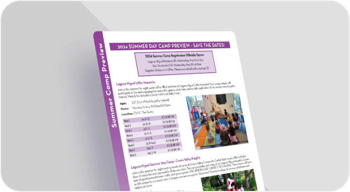 w 2024 SUMMER DAY CAMP PREVIEW - SAVE THE DATES! vie 2024 Summer Camp Registration O昀케cially Opens: e Laguna Niguel Residents (R): Wednesday, May 1st at 8am Non- Residents (NR): Wednesday, May 8th at 8am Register: Online or In-O昀케ce Please see refund policy on page 35 amp PrLaguna Niguel Little Monarchs Join us this summer for eight weeks of fun 昀椀lled activities at Laguna Niguel Little Monarchs! Your young camper will participate in fun and engaging themed crafts, games, circle time, and outside exploration. Every camper must be potty- trained. Weekly fee includes a camp t-shirt and daily snack. Ages: 3.5*-5 yrs (*Must be potty-trained) Hours: Monday-Friday, 9:00am-12:00pm, Location: CVCC, The Studio Summer C Week 1 Jun 17-21 R $150/NR $160 Week 2 Jun 24-28 R $150/NR $160 Week 3 Jul 8-12 R $150/NR $160 Week 4 Jul 15-19 R $150/NR $160 Week 5 Jul 22-26 R $150/NR $160 Week 6 Jul 29-Aug 2 R $150/NR $160 Week 7 Aug 5-9 R $150/NR $160 Week 8 Aug 12-16 R $150/NR $160 Laguna Niguel Summer Day Camp - Crown Valley Knights Join us this summer for eight exciting weeks of camp at Crown Valley Community Center! Each week is 昀椀lled with four days of onsite fun and one weekly o昀昀site excursion. This camp includes swimming at the Laguna Niguel Aquatics Center, special guest presentations, crafts, and group games. EXCURSIONS ARE SUBJECT TO CHANGE. These camps will have an 8:1 camper to counselor ratio. Campers are encouraged to “disconnect” from technology by leaving cell phones and tablets at home. Ages: (6-9yrs) Hours: Monday-Friday, 7:30am-5:30pm Location: CVCC, View Room & CVP, Lower Soccer Field Week 1 Jun 17-21 R $260/NR $270 Week 2 Jun 24-28 R $260/NR $270 Week 3 Jul 8-12 R $260/NR $270 Week 4 Jul 15-19 R $260/NR $270 Week 5 Jul 22-26 R $260/NR $270 Week 6 Jul 29-Aug 2 R $260/NR $270 Week 7 Aug 5-9 R $310/NR $320 Week 8 Aug 12-16 R $310/NR $320 Special Registration Date! Register early! Summer Camp registration will be open for one week only from Monday, April 1st through Sunday, April 7th. PARKS & RECREATION OFFICE: (949) 425-5100 | ONLINE REGISTRATION: CityofLagunaNiguel.org/Registration REGISTRATION FORM: Page 32 12