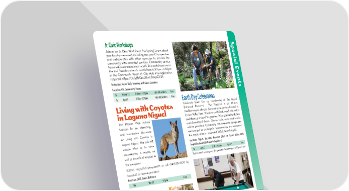 Jr. Civic Workshops Special E Join us for Jr. Civic Workshops this Spring! Learn about your local government, including how your City operates and collaborates with other agencies to provide the community with essential services. Community service hours will be awarded each month. The workshops are on the 2nd Tuesday of each month from 6:30pm - 7:30pm in the Community Room at City Hall. Pre-registration v required: https://bit.ly/JrCivicWorkshops23-24 en Instructor: Mayor Kelly Jennings and Guest Speakers Location: CH, Community Room ts Tu March 12 6:30pm-7:30pm 6th-8th Graders Free Tu April 9 6:30pm-7:30pm 6th-8th Graders Free Earth Day Celebration Living with Coyotes Celebrate Earth Day by volunteering at the Niguel Botanical Preserve! The Preserve is an 18-acre in Laguna Niguel Mediterranean climate demonstration garden located in Crown Valley Park. Volunteers will plant, weed, add mulch Join Mission Viejo Animal and clean up areas of the gardens. Wear gardening clothes Services for an interesting and closed-toed shoes. Gloves, tools, water and snacks and informative discussion will be provided. Community and corporate groups are on Living with Coyotes in encouraged to participate. Sponsorships are welcomed. Laguna Niguel. The talk will Pre-registration is required at bit.ly/LNearthday24. include what to do when Location: Niguel Botanical Preserve (Meet at Crown Valley Park encountering a coyote, as Amphitheater 29751 Crown Valley Pkwy) well as the role of coyotes in Sa Apr 20 8:30-11:30am 6yrs+* Free the ecosystem. *Adults must accompany & supervise children ages 6-12 years old. R.S.V.P.: https://bit.ly/coyotesLN or call (949)425-5100 by March 19 to reserve your spot. Location: CVCC, Crown Ballroom We Mar 20 6-8pm Free Bunny Bonanza Hop on over to Chapparosa Park for Bunny Bonanza on Laguna Niguel Senior Games Saturday, March 23rd. Join us The City of Laguna Niguel is proud to present the 4th Annual for crafts, games, face painting, Senior Games. Adults ages 55 and older will compete for medals Touch-A-Truck, entertainment, in events including pickleball, billiards, table tennis, bocce ball and photos with Mr. and Mrs. Bunny. Note: There will NOT and swimming. Registration begins on March 4, 2024 and ends be an egg hunt at this event. on April 5, 2024. Register online or at Sea Country Senior Activities may be cancelled if it and Community Center or Crown Valley Community Center. rains on event day. Please leave your furry friends at Registration fees: $10 for residents, $15 for non-residents for home. No pets or smoking allowed at the event. each event. For more information, call (949) 425-5151. Location: Chapparosa Park Location: Varies Sa Mar 23 10am-1pm All Ages Free F May 3 Open House/Packet Pick Up 4-6pm Free Sa-Su May 4-5 All events Times Vary $10-$15 PARKS & RECREATION OFFICE: (949) 425-5100 | ONLINE REGISTRATION: CityofLagunaNiguel.org/Registration REGISTRATION FORM: Page 32 7