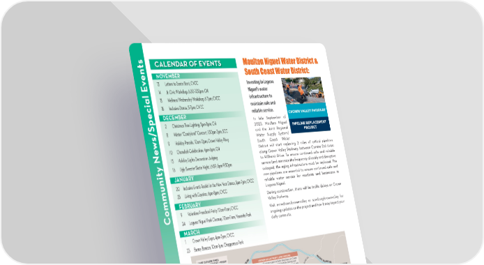 ts CALENDAR OF EVENTS Moulton Niguel Water District & en NOVEMBER South Coast Water District: v 13 Letters to Santa Start, CVCC Investing in Laguna E 14 Jr. Civic Workshop, 6:30-7:30pm; CH Niguel’s water 15 Wellness Wednesday Workshop, 6-7pm; CVCC infrastructure to 18 Inclusive Dance, 5-7pm; CVCC maintain safe and DECEMBER reliable service. Special 2 Christmas Tree Lighting, 5pm-8pm; CH In late September of 2023, Moulton Niguel s/ 8 Winter “Candyland” Concert, 1:30pm-3pm; SCC and the Joint Regional w 9 Holiday Parade, 10am-12pm; Crown Valley Pkwy Water Supply System/ e South Coast Water 10 Chanukah Celebration, 4pm-6pm; CH District will start replacing 2 miles of critical pipelines N 13 Holiday Lights Decoration Judging along Crown Valley Parkway, between Camino Del Avion to Hillhurst Drive. To ensure continued safe and reliable 16 Ugly Sweater Skate Night, LNSP; 6pm-9:30pm service (and minimize the frequency of costly and disruptive JANUARY outages), the aging infrastructure must be replaced. The new pipelines are essential to ensure continued safe and 20 Inclusive Event: Rockin’ in the New Year Dance, 5pm-7pm; CVCC reliable water service for residents and businesses in 25 Living with Coyotes, 6pm-8pm, CVCC Laguna Niguel. FEBRUARY During construction, there will be tra昀케c delays on Crown ommunity Valley Parkway. 9 Valentine Preschool Party, 10am-11am; CVCC Visit mnwd.com/crownvalley or scwd.org/crownvalley for C 24 Laguna Niguel Park Cleanup, 10am-11am; Yosemite Park ongoing updates on the project and how it may impact your MARCH daily commute. 1 Crown Valley Expo, 4pm-7pm; CVCC 23 Bunny Bonaza, 10am-1pm; Chapparosa Park PARKS & RECREATION OFFICE: (949) 425-5100 | 6 ONLINE REGISTRATION: CityofLagunaNiguel.org/Registration REGISTRATION FORM: Page 28