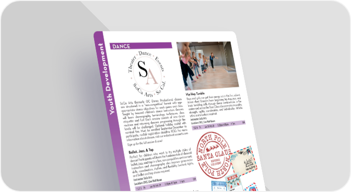 t DANCE elopmen v e D Hip Hop Tumble SoCa Arts (formerly OC Dance Productions) classes Boys and girls can get their energy out in this fun, upbeat outh are structured in a “non-competitive” format with age- dance class! Dancers learn beginning hip hop, jazz, and Y appropriate dance objectives for each genre and class. basic tumbling skills through dance combinations. in the Taught by tenured children’s dance instructors dancers center and across the 昀氀oor. Class also promotes musicality, will learn choreography, terminology, techniques, class strength, agility, coordination, and individuality. Athletic etiquette and fun! Each session consists of new dance attire and sneakers required. routines and returning dancers progressing through the Instructor: SoCa Arts levels will be challenged. Optional holiday recital with Location: CVCC, Live Well Room nominal fee. Must be enrolled September-December to 15214 Th Jan 18-Feb 29 5:20pm-6:05pm 4-7yrs $99 participate, recital registration deadline 9/30. For more information about classes, visit our website at socaarts.com Sign up for the full session & save! Ballet, Jazz, & Tap Perfect for children who want to try multiple styles of dance! Participants will learn the fundamentals of classical ballet, jazz, and tap in a fun, non-competitive environment. Instruction and choreography also improve gross-motor skills, coordination, rhythm, and 昀氀exibility. Leotard, tights, and ballet and tap shoes required. Instructor: SoCa Arts Location: CVCC, Live Well Room 15213 Th Jan 18-Feb 29 3:30pm-4:15pm 3-6yrs $99 Princess Ballet Twirl your way into Princess Ballet! Participants learn beginning ballet and gross motor skills with a princess twist while listening to favorite princess songs. Class promotes coordination, 昀氀exibility, poise, and listening skills. Class includes short princess storytimes and crafting. Leotard, tights, and ballet shoes required. Instructor: SoCa Arts Location: CVCC, Live Well Room 15215 Th Jan 18-Feb 29 4:25pm-5:10pm 2.5-4yrs $99* *$5 materials fee due to instructor at 昀椀rst class Letters to Santa Do you want to receive a letter from Santa this year? Santa has asked the City of Laguna Niguel to help mail letters to him. Starting November 11, 2023, you can drop o昀昀 a letter to send to Santa in the “North Pole” mailbox at Crown Valley Community Center. Please see page 7 for more details. PARKS & RECREATION OFFICE: (949) 425-5100 | ONLINE REGISTRATION: CityofLagunaNiguel.org/Registration REGISTRATION FORM: Page 28 1O