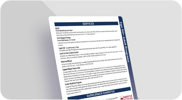 A HICAP SERVICES ge First & Third Monday, 9am-12pm 50+ Health Insurance Counseling Advocacy Program (HICAP) is o昀昀ered through the Council on Aging-Southern California. HICAP o昀昀ers free unbiased and individualized counseling on Medicare, Medicare Policies, and other related health insurance topics. Please call (949)425-5151 to make an appointment. Grief Support Group A First & Third Tuesday, 10-11:30am A safe place for you to share openly in an informal setting about the loss of your loved one with others who are experiencing similar grief. No appointment dult necessary. Legal Aid - Second Thursday, 9-12pm The Legal Aid Society o昀昀ers FREE legal advice to seniors (must be at least 60 years of age or older). Please call (949)425-5151 to make an appointment. Pr Lunch at Sea Country Center Hot lunches are available Monday-Friday at 11:45am. Reservations are required. A suggested donation of $5.50 is requested for seniors ages 60+. For more ogr information, call our on-site Nutrition Coordinator at (949) 362-2807. (Provided by Age Well Senior Services.) Meals on Wheels ams For those who qualify, home delivered meals are available through Age Well Senior Services. Monday-Friday, volunteers deliver meals to those who are unable to come to the center. For more information, call (949) 362-2807. Laguna Niguel Senior Club The Laguna Niguel Senior Club is a non-pro昀椀t organization that operates independently from the City's Sea Country Center. Activities sponsored by the Senior Club are open to all seniors who visit the Center. The Senior Club publishes a monthly newsletter which features entertainment and lunch provided by AgeWell Nutrition Program. Membership is $25 for singles; $45 for couples or 2 people at the same address. Membership is not required to enjoy Club-sponsored activities o昀昀ered at Sea Country, but members may receive discounts. The City provides the Senior Club with an o昀케ce in the Center which is open Monday, Wednesday, and Friday from 10am-2pm. For more information, please call the Senior Club at (949) 362-2937. Senior Mobility Program Through OCTA Measure M2 funding, this service provides roundtrip transportation from resident’s homes to Sea Country Senior & Community Center, grocery stores, and non-emergency medical appointments, through a City contract with California Yellow Cab. This program provides curb-to-curb service on demand from 9am-4pm, Monday through Friday, excluding holidays. This program is open to Laguna Niguel residents, ages 60 and older. To register, please call Sea Country Center at (949) 425-5151. SADDLEBACK EMERITUS Saddleback College Emeritus Classes Founded in 1976, the Saddleback College Emeritus Institute was established to create lifelong learning opportunities primarily for the older adult. A dynamic array of high-quality, academic classes are available in over 30 disciplines, taught by expert instructors. Classes are o昀昀ered at a variety of locations throughout the community on a non-credit, tuition-free basis. For more information: saddleback.edu/emeritus or call the Emeritus Institute at (949) 582-4835. Saddleback Emeritus-Spring Schedule Emeritus Spring Semester Dates: EHEA 501 Improving Investments M 1-2:50pm January 16 to May 22 EHEA 529 Focused Movement (Tai Chi) Th 1-2:50pm *No class: Feb 19, Feb 20, Feb 29, Mar 4, Mar 5, Mar 18, EHEA 500 Cardio Health (Aerobics) Tu, Th 9:10-10:00am Mar 19, Mar 21 GAMES Swing by Sea Country Senior and Community Center to pick up a copy of the latest Sea Country Dive Activity Guide for a complete list of activities, classes and events for adults 50+. Weekly activities include active and table games such as table tennis, billiards, Wii Bowling, bridge, Pinochle, mahjong, Scrabble and many more! SEA COUNTRY CENTER (949) 425-5151 | ONLINE REGISTRATION: CityofLagunaNiguel.org/Registration REGISTRATION FORM: Page 28 23