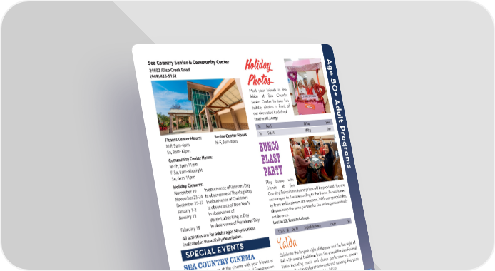Sea Country Senior & Community Center A 24602 Aliso Creek Road Holiday ge (949) 425-5151 Photos 50+ Meet your friends in the lobby at Sea Country Senior Center to take fun A holiday photos in front of our decorated backdrop! dult Location SCC, Lounge Tu Dec 5 All Day Free Pr Fitness Center Hours: Senior Center Hours: Tu Feb 14 All Day Free M-F, 9am-4pm M-F, 9am-4pm Sa, 9am-12pm BUNCO ogr Community Center Hours: M-Th, 5pm-11pm BLAST ams F-Sa, 6am-Midnight Su, 6am-11pm PARTY Holiday Closures: November 10 In observance of Veterans Day Play bunco with November 23-24 In observance of Thanksgiving friends at Sea December 25-27 In observance of Christmas Country! Refreshments and prizes will be provided. You are January 1-2 In observance of New Year’s encouraged to dress according to the theme. Bunco is easy January 15 In observance of to learn and beginners are welcome. With our special rules, Martin Luther King Jr. Day players keep the same partner for the entire game and only February 19 In observance of Presidents’ Day rotate once. All activities are for adults ages 50+yrs unless Location SCC, Yosemite Ballroom indicated in the activity description. 15185 M Dec 11 Jingle Bells Bunco 1-3pm $5 SPECIAL EVENTS Yalda SEA COUNTRY CINEMA Celebrate the longest night of the year and the last night of Enjoy a fun afternoon at the cinema with your friends at Fall with several traditions from the annual Persian Festival Sea Country Senior and Community Center! Free popcorn Yalda including music and dance performances, poetry and beverages will be provided. Must be 50+ to participate. reading, Persian-style refreshments and dancing. Everyone Call the front desk to RSVP! is welcome! Call the front desk to RSVP. Location SCCC, Grand Ballroom Location SCC, Grand Ballroom F Jan 12 “Hidden Figures (2016)” 1-3:30pm Free Th Dec 21 1:00pm Free F Jan 26 “Chicago (2002)” 1-3:30pm* Free F Feb 9 “Roman Holiday (1953)” 1-3:30pm Free *Film follows guest speaker Hollywood photographer Barton Mac Leod WINTER “CANDY LAND” CONCERT Take a trip down memory lane with music historian Larry Get into the holiday spirit at Sea Country Center! Listen to Maurer! Learn interesting facts about famous musicians your favorite holiday songs in a sweet winter wonderland, and stars from yesteryear. The presentation includes music, short videos, and historical photos. performed by the talented musician Matt Grey, a Sea Country Location SCCC favorite. Hot Cocoa Bar and snacks will be provided. Location SCC, Grand Ballroom Location SCC, Grand Ballroom 15187 Tu Jan 9 Jewish Songwriters: The Next Generation 1:30-2:30pm $5 15186 F Dec 8 1:30-3pm $5 15188 Tu Feb 6 Movie Musicals of the 1930s 1:30-2:30pm $5 SEA COUNTRY CENTER: (949) 425-5151 | ONLINE REGISTRATION: CityofLagunaNiguel.org/Registration REGISTRATION FORM: Page 28 19
