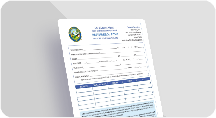 City of Laguna Niguel Contact Information: Parks and Recreation Department Crown Valley Park REGISTRATION FORM 29751 Crown Valley Parkway Laguna Niguel, CA 92677 ONE FORM PER PERSON REQUIRED (949) 425-5100 Registration@CityofLagunaNiguel.org PARTICIPANT’S NAME: _____________________________________________________ SEX ____ D.O.B_____/_____/_____ GRADE ________ PARENT/GUARDIAN NAME (if participant is a minor): __________________________________________________________________________ ADDRESS _______________________________________________________________ CITY _______________________ ZIP ______________ HOME PHONE ( _____ ) ______ - __________ WORK PHONE ( _____ ) ______ - _________ CELL PHONE ( _____ ) ______ - ___________ EMAIL ADDRESS __________________________________________________________@ ___________________________________________ EMERGENCY CONTACT (other than parent) _______________________________________________ PHONE ( _____ ) ______ - ___________ MEDICAL INFORMATION ________________________________________________________________________________________________ If you need special assistance, please contact the Parks and Recreation Department at least one week prior to the start of activity. ACTIVITY # NAME OF ACTIVITY DAY/TIME CHECK # FEE I voluntarily agree to have myself or my child participate and I realize that every precaution is taken to eliminate any injury or hazards to myself or my child, and that a competent supervisor is present; however, in the event of any injury to myself or my child, I hereby waive, release and hold harmless from any liability for damages or claims for damages for personal injury, including accidental death, as well as from claims for personal property damage which may arise in connection with the program, against the City of Laguna Niguel and all it’s o昀케cers, agents and employees. I give consent to any X-Ray examination, anesthetic, medical or surgical diagnosis tendered under the general or special supervisor of any member of the medical sta昀昀 and emergency room sta昀昀 licensed under the Medicine Practice Act or a dentist licensed under the Dental Practice Act or the sta昀昀 of any acute General hospital holding a license to operate from the California Department of Public Health. It is understood that this authorization is given in advance of diagnosis, treatments, or hospital care being required but is given to provide the aforementioned medical/dental personnel authority to render care as they deem advisable. It is understood that e昀昀orts shall be made to contact the undersigned prior to rendering treatment, but that treatment will not be withheld if the undersigned cannot be reached. I permit the use of activity/event photography and/or video of my child or myself for LN Parks & Recreation media promotion. I HAVE READ AND UNDERSTAND THIS RELEASE FROM LIABILITY AND THE CANCELATION/REFUND POLICY. ________________________________________________________________________________ Date _________/_________/_________ (Signature) Parent or Guardian must sign for those under 18 years of age PAYMENT INFORMATION: NAME ON CARD_____________________________________________________________________________________________________ CREDIT CARD NUMBER __________________________________________________________ EXP DATE _________/_________/_________ 28 3-DIGIT CVC CODE ______________