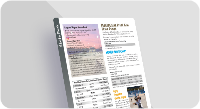 ark Laguna Niguel Skate Park Thanksgiving Break Mini 27745 Alicia Parkway, Laguna Niguel, CA 92677 Skate Camps P (949) 916-7755 • (949) 916-7766 Join Basics of Skateboarding for a mini 3 day camp e lnskatepark@cityo昀氀agunaniguel.org Monday, November 20 - Wednesday, November 22. at lnsk8park This camp focuses on basic skills and has a ratio of 6 Hours of Operation: students per 1 instructor. School Days: 12-9:30pm Instructor: Matt Sheridan, Basics of Skateboarding Sk Weekends, Holidays, and Location: LNSP CUSD School Vacations: 9am-9:30pm November 20 – 22 Residents: $40 annual pass* *$10 materials fee due to instructor *Requires proof of residency Winter Skate Camp Non-Residents: $80 annual pass One Day Pass: $10 Improve your skating skills, make new friends, and achieve The Skatepark is supervised by the Parks and Recreation Department. Daily your skate goals. Bring your skateboard and gear to skate or annual passes, along with an up-to-date liability waiver, are required for the morning away! All skaters must wear a helmet, elbow, and all individuals to use the facility. If the individual is under 18 years old, a kneepads at all times and have a liability waiver signed by a parent or legal guardian must either be present to sign the liability waiver or parent/guardian on 昀椀le. a notarized copy of the waiver must be presented. Proof of residency must This camp focuses on basic skills and has a ratio of 6 students be provided to acquire the resident rate. Helmets, plastic capped elbow, per 1 instructor. and knee pads are required at all times while inside the Skate Park. Instructor: Skate Park Sta昀昀 Location: LNSP Modi昀椀ed Skate Park Modi昀椀ed/Holiday Hours For more information, call (949) 916-7755 Mini Winter Camp Dec 27-29 9am-11am 3-13 yrs $155 November 11 Holiday 9am-9:30pm Saturdays Dec 2,9,16,23 9am-11am 3-13 yrs $185 November 23-24 Holiday Park Closed Saturdays Jan 6,13,20,27 9am-11am 3-13yes $185 Dec 16 Ugly Sweater Contest 6pm-9:30pm Register Early! Help us avoid canceling classes due to low enrollment. Dec 24-25 Holiday Park Closed Ugly Dec 26-Jan 5 Winter Recess 9am-9:30pm Dec 31-Jan 1 Holiday Park Closed Sweater Jan 15 Holiday 9am-9:30pm Skate Night Feb 16 Holiday 9am-9:30pm Join us this winter for an Feb 19 Holiday 9am-9:30pm Ugly Sweater Late Night Skate Night. Come to the BMX Sessions Skate Park and shred until midnight in your favorite Laguna Niguel Skate Park welcomes BMX and Dirt Jump/ ugly holiday sweaters! Park speci昀椀c bikes to the skate park. We have 3 weekly The best ugly sweater will “BMX sessions” where the park is exclusive to BMX and win a prize. Cost: Free for dirt jump/park speci昀椀c bikes. Skateboarding and inline members/$10 entrance skating is not permitted during these sessions. All riders for non-members*. All must have a liability waiver signed by a parent/guardian participants require a valid prior to entering the park and must wear elbow pads, waiver on 昀椀le signed by knee pads, and a helmet. Contact the park at (949) 916- their parents or guardian. (Food will be available for purchase.) 7755 or visit CityofLagunaNiguel.org for a list of rules Location: LNSP and regulations pertaining to the use of BMX bikes at the Sa Dec 16 6pm – 9:30pm All Ages Free* facility. Bike Session Hours: Tuesday: 7-9:30pm | Friday: 12-4:30pm | Sunday: 4:30-9:30pm SKATE PARK: (949) 916-7755 | ONLINE REGISTRATION: CityofLagunaNiguel.org/Registration REGISTRATION FORM: Page 28 14