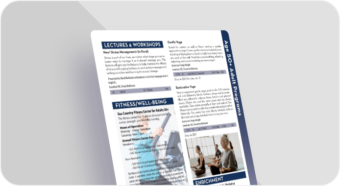 Gentle Yoga A LECTURES & WORKSHOPS Suited for seniors as well as those wanting a gentler ge New! Stress Management (in Farsi) approach to yoga. Covers gentle stretches in seated poses, Stress is part of our lives, no matter what stage you are in. standing or laying down on back or belly. Sometimes chairs 50+ Learn ways to manage it so it doesn’t manage you. This are used, or the wall. Much focus on breathing, adapting, lecture will give you techniques to help minimize the e昀昀ects adjusting, and accommodating are encouraged. of stress with coping techniques such as time management, Instructor: Angie Knight setting priorities and learning to accept change. Location: SCC, Yosemite Ballroom A Presented by Omid Multicultural Institute in the Farsi language (not in 15190 M Jan 8-Feb 12 (5 sessions) 10-11:15am $85 dult English). Drop-In: $20, No class: Jan 15 Location SCC, Grand Ballroom M Feb 26 10-11:30am Free Restorative Yoga Pr Stay in supported gentle yoga positions for 5-10 minutes with aids (blankets, blocks, bolsters, straps and lavender- FITNESS/WELL-BEING 昀椀lled eye pillows) to release stress, tension and physical ogr issues. Chairs are used for some poses and are always available. Class starts promptly at 6pm and ends at 7pm. Sea Country Fitness Center for Adults 50+ Please arrive early to collect your materials and get settled. ams The 昀椀tness center has 15 pieces of equipment for Materials: The center has mats, blocks, blankets, bolsters cardio, strength, and 昀氀exibility training. (limited) and straps, but feel free to bring your own. Hours of Operation Instructor: Angie Knight Monday – Friday, 9am-4pm Location: SCC, Yosemite Ballroom Saturday, 9am-12pm 15275 Th Jan 11-Feb 8 (5 sessions) 6-7pm $85 Annual Fitness Center Fee Drop-In: $20 Residents: • $25 for Group Equipment Orientation • $45 for an Individual Equipment Orientation Non-Residents: • $40 for Group Equipment Orientation • $60 for an Individual Equipment Orientation The Fitness Center is located within the Sea Country Senior and Community Center. A registration packet that includes a registration form, liability waiver, and medical release form signed by your doctor, is required at the time of registration. Proof of residency is required by showing a utility bill. Fitness center membership cards will be issued once all required forms are submitted, and an equipment orientation has been completed. ENRICHMENT Line Dancing New! Increase Your Creativity Workshop Line Dancing is a fun and easy way to get moving. Come Reach your full creative potential with this innovative new workshop. learn this popular dance and get in shape at the same time! Enjoy a morning of play, prompts, games, and exercises designed This class is appropriate for beginners and intermediate to expand your mind and increase your creative abilities. Activating students. No partners needed, no experience needed, and your right brain through mental stimulation and activities has been all levels are welcome! Come have fun with us! shown to increase vitality and potentially generate new brain cells. Instructor:Bailey Carrillo Drawing, painting, and putting things down on paper helps you Location: SCC, Grand Ballroom explore your creative side by shutting o昀昀 conscious thoughts. Join us Saturday morning and discover your inner child and new ways 15189 F Dec 1-Dec 15 (2 sessions) 9:15-10am $18 to think about your creative endeavors. Must enroll by Jan 3. No class: Dec 8 / Drop-In: $10 Instructor: MaryAnn Easley Location: SCC, Grand Ballroom 15192 Sa Jan 6 9:15am-12:15pm $25* *$15 cash material fee due to instructor at start of class. SEA COUNTRY CENTER: (949) 425-5151 | ONLINE REGISTRATION: CityofLagunaNiguel.org/Registration REGISTRATION FORM: Page 28 21