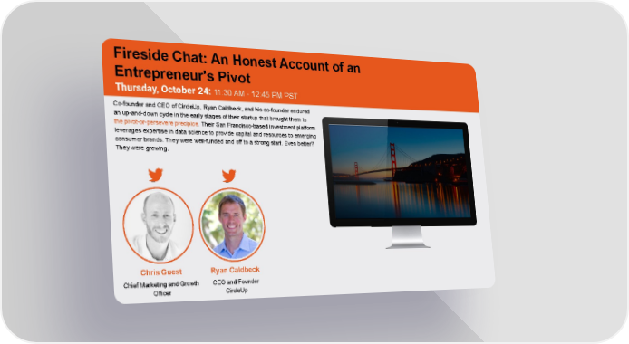 Fireside Chat: An Honest Account of an Entrepreneur's Pivot Thursday, October 24: 4:00 PM - 5:30 PM PST General in Chief a16zCo-founder and CEO of CircleUp, Ryan Caldbeck, and his co-founder endured an up-and-down cycle in the early stages of their startup that brought them to the pivot-or-persevere precipice. Their San Francisco-based investment platform leverages expertise in data science to provide capital and resources to emerging consumer brands. They were well-funded and off to a strong start. Even better? They were growing. Chris Guest Ryan Caldbeck Chief Marketing and Growth CEO and Founder Officer CircleUp