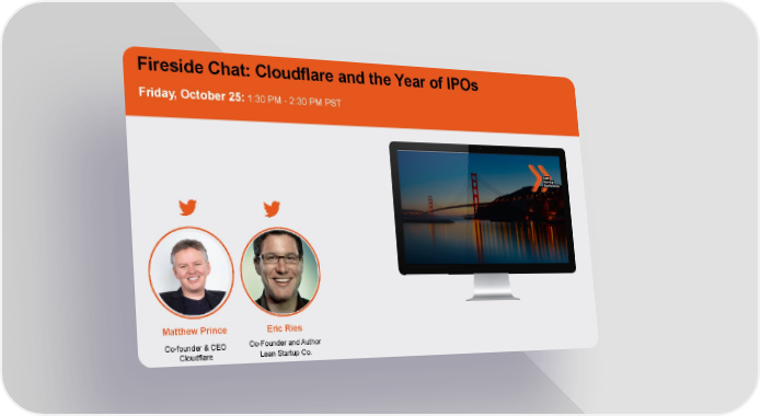 Fireside Chat: Cloudflare and the Year of IPOs Friday, October 25: 1:30 PM - 2:30 PM PST Matthew Prince Eric Ries Co-Founder and Author Co-founder & CEO Lean Startup Co. Cloudflare