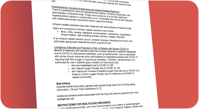 Storage Refrigerate unopened vials at 2°C to 8°C (36°F to 46°F) in the original carton to protect from light. Do not freeze, shake, or expose to direct light. Warnings There are limited clinical data available for bamlanivimab. Serious and unexpected adverse events may occur that have not been previously reported with bamlanivimab use. Hypersensitivity Including Anaphylaxis and Infusion-Related Reactions There is a potential for serious hypersensitivity reaction, including anaphylaxis, with administration of bamlanivimab. If signs and symptoms of a clinically significant hypersensitivity reaction or anaphylaxis occur, immediately discontinue administration and initiate appropriate medications and/or supportive therapy. Infusion-related reactions have been observed with administration of bamlanivimab. Signs and symptoms of infusion related reactions may include: fever, chills, nausea, headache, bronchospasm, hypotension, angioedema, throat irritation, rash including urticaria, pruritus, myalgia, dizziness. If an infusion-related reaction occurs, consider slowing or stopping the infusion and administer appropriate medications and/or supportive care. Limitations of Benefit and Potential for Risk in Patients with Severe COVID-19 Benefit of treatment with bamlanivimab has not been observed in patients hospitalized due to COVID-19. Monoclonal antibodies, such as bamlanivimab, may be associated with worse clinical outcomes when administered to hospitalized patients with COVID-19 requiring high flow oxygen or mechanical ventilation. Therefore, bamlanivimab is not authorized for use in patients [see Limitations of Authorized Use]: o who are hospitalized due to COVID-19, OR o who require oxygen therapy due to COVID-19, OR o who require an increase in baseline oxygen flow rate due to COVID-19 in those on chronic oxygen therapy due to underlying non-COVID-19 related comorbidity. Side Effects Adverse events have been reported with bamlanivimab [see Full EUA Prescribing Information, Clinical Trials Experience (6.1)]. Additional adverse events associated with the drug may become apparent with more widespread use. INSTRUCTIONS FOR HEALTHCARE PROVIDERS As the healthcare provider, you must communicate to your patient or parent/caregiver, as age appropriate, information consistent with the “Fact Sheet for Patients, Parents and Caregivers” (and provide a copy of the Fact Sheet) prior to the patient receiving bamlanivimab, including: FDA has authorized the emergency use of bamlanivimab for the treatment of mild to moderate COVID-19 in adults and pediatric patients with positive results of direct SARS-CoV-2 viral testing who are 12 years of age and older weighing at 5
