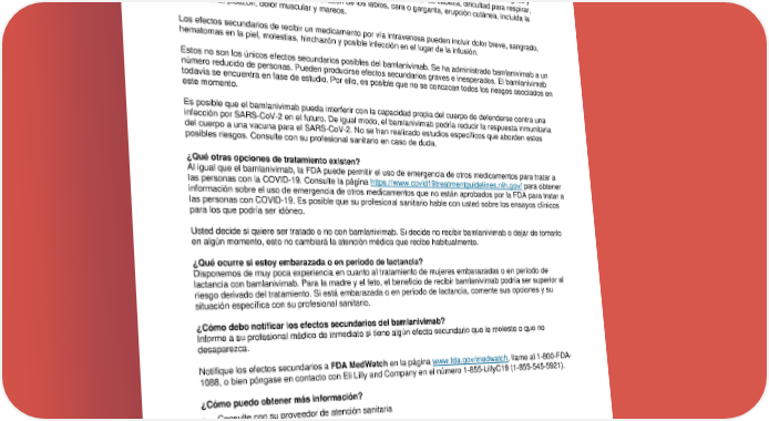 ¿Cuáles son los posibles efectos secundarios importantes del bamlanivimab? Los posibles efectos secundarios del bamlanivimab son: Reacciones alérgicas. Se pueden producir reacciones alérgicas durante y después de la infusión de bamlanivimab. Informe a su profesional sanitario de inmediato si tiene alguno de los siguientes signos y síntomas de reacciones alérgicas: fiebre, escalofríos, náuseas, dolor de cabeza, dificultad para respirar, presión arterial baja, sibilancias, hinchazón de los labios, cara o garganta, erupción cutánea, incluida la urticaria, picazón, dolor muscular y mareos. Los efectos secundarios de recibir un medicamento por vía intravenosa pueden incluir dolor breve, sangrado, hematomas en la piel, molestias, hinchazón y posible infección en el lugar de la infusión. Estos no son los únicos efectos secundarios posibles del bamlanivimab. Se ha administrado bamlanivimab a un número reducido de personas. Pueden producirse efectos secundarios graves e inesperados. El bamlanivimab todavía se encuentra en fase de estudio. Por ello, es posible que no se conozcan todos los riesgos asociados en este momento. Es posible que el bamlanivimab pueda interferir con la capacidad propia del cuerpo de defenderse contra una infección por SARS-CoV-2 en el futuro. De igual modo, el bamlanivimab podría reducir la respuesta inmunitaria del cuerpo a una vacuna para el SARS-CoV-2. No se han realizado estudios específicos que aborden estos posibles riesgos. Consulte con su profesional sanitario en caso de duda. ¿Qué otras opciones de tratamiento existen? Al igual que el bamlanivimab, la FDA puede permitir el uso de emergencia de otros medicamentos para tratar a las personas con la COVID-19. Consulte la página https://www.covid19treatmentguidelines.nih.gov/ para obtener información sobre el uso de emergencia de otros medicamentos que no están aprobados por la FDA para tratar a las personas con COVID-19. Es posible que su profesional sanitario hable con usted sobre los ensayos clínicos para los que podría ser idóneo. Usted decide si quiere ser tratado o no con bamlanivimab. Si decide no recibir bamlanivimab o dejar de tomarlo en algún momento, esto no cambiará la atención médica que recibe habitualmente. ¿Qué ocurre si estoy embarazada o en período de lactancia? Disponemos de muy poca experiencia en cuanto al tratamiento de mujeres embarazadas o en período de lactancia con bamlanivimab. Para la madre y el feto, el beneficio de recibir bamlanivimab podría ser superior al riesgo derivado del tratamiento. Si está embarazada o en período de lactancia, comente sus opciones y su situación específica con su profesional sanitario. ¿Cómo debo notificar los efectos secundarios del bamlanivimab? Informe a su profesional médico de inmediato si tiene algún efecto secundario que le moleste o que no desaparezca. Notifique los efectos secundarios a FDA MedWatch en la página www.fda.gov/medwatch, llame al 1-800-FDA- 1088, o bien póngase en contacto con Eli Lilly and Company en el número 1-855-LillyC19 (1-855-545-5921). ¿Cómo puedo obtener más información? Consulte con su proveedor de atención sanitaria Visite la página www.bamlanivimab.com Visite la página https://www.covid19treatmentguidelines.nih.gov/ Póngase en contacto con su departamento de salud pública local o estatal 2