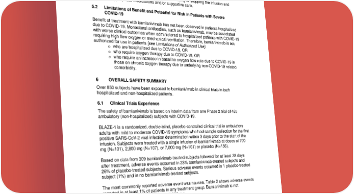 Infusion-related reactions have been observed with administration of bamlanivimab. Signs and symptoms of infusion related reactions may include: • fever, chills, nausea, headache, bronchospasm, hypotension, angioedema, throat irritation, rash including urticaria, pruritus, myalgia, dizziness. If an infusion-related reaction occurs, consider slowing or stopping the infusion and administer appropriate medications and/or supportive care. 5.2 Limitations of Benefit and Potential for Risk in Patients with Severe COVID-19 Benefit of treatment with bamlanivimab has not been observed in patients hospitalized due to COVID-19. Monoclonal antibodies, such as bamlanivimab, may be associated with worse clinical outcomes when administered to hospitalized patients with COVID-19 requiring high flow oxygen or mechanical ventilation. Therefore, bamlanivimab is not authorized for use in patients [see Limitations of Authorized Use]: o who are hospitalized due to COVID-19, OR o who require oxygen therapy due to COVID-19, OR o who require an increase in baseline oxygen flow rate due to COVID-19 in those on chronic oxygen therapy due to underlying non-COVID-19 related comorbidity. 6 OVERALL SAFETY SUMMARY Over 850 subjects have been exposed to bamlanivimab in clinical trials in both hospitalized and non-hospitalized patients. 6.1 Clinical Trials Experience The safety of bamlanivimab is based on interim data from one Phase 2 trial of 465 ambulatory (non-hospitalized) subjects with COVID-19. BLAZE-1 is a randomized, double-blind, placebo-controlled clinical trial in ambulatory adults with mild to moderate COVID-19 symptoms who had sample collection for the first positive SARS-CoV-2 viral infection determination within 3 days prior to the start of the infusion. Subjects were treated with a single infusion of bamlanivimab at doses of 700 mg (N=101), 2,800 mg (N=107), or 7,000 mg (N=101) or placebo (N=156). Based on data from 309 bamlanivimab-treated subjects followed for at least 28 days after treatment, adverse events occurred in 23% bamlanivimab-treated subjects and 26% of placebo-treated subjects. Serious adverse events occurred in 1 placebo-treated subject (1%) and in no bamlanivimab-treated subjects. The most commonly reported adverse event was nausea. Table 2 shows adverse events reported in at least 1% of patients in any treatment group. Bamlanivimab is not authorized at doses of 2,800 mg or 7,000 mg. 13 Reference ID: 4699500