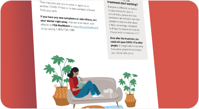 What happens after my appointment? In the days and weeks after your infusion, your doctor or the clinic staff will keep checking with you to see how you feel and which COVID-19 symptoms How soon does the you have. treatment start working? They may also ask you to come in again to do Everyone is different, so there’s another COVID-19 test or to take samples of blood no way to know for sure. In from your arm. clinical trials, people who took bamlanivimab started to see their If you have any new symptoms or side effects, tell symptoms improve after about your doctor right away. You can also report side 6 days, on average, compared effects to FDA MedWatch at www.fda.gov/medwatch to 8 days for people who took an or by calling 1-800-FDA-1088. 16 infusion with no medicine in it. Even after the treatment, you could still pass COVID-19 to other people. It’s important to stay away from other people for as long as your doctor tells you to. 16 Eli Lilly and Company: http://pi.lilly.com/eua/bamlanivimab-eua-factsheet-hcp.pdf Page 8 | PP-BM-US-0009 November 2020 ©Lilly USA, LLC 2020. All rights reserved.