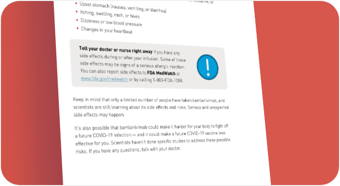 What are the side effects? 13 Side effects can range from mild to serious and may include: • Wheezing (noisy breathing that may sound like whistling) or trouble breathing • Swollen lips, face, or throat • Flu-like symptoms (fever, sweating, chills, cough, sore throat, headache, or muscle pain) • Upset stomach (nausea, vomiting, or diarrhea) • Itching, swelling, rash, or hives • Dizziness or low blood pressure • Changes in your heartbeat Tell your doctor or nurse right away if you have any side effects during or after your infusion. Some of these side effects may be signs of a serious allergic reaction. You can also report side effects to FDA MedWatch at www.fda.gov/medwatch or by calling 1-800-FDA-1088. Keep in mind that only a limited number of people have taken bamlanivimab, and scientists are still learning about its side effects and risks. Serious and unexpected side effects may happen. It’s also possible that bamlanivimab could make it harder for your body to fight off a future COVID-19 infection — and it could make a future COVID-19 vaccine less effective for you. Scientists haven’t done specific studies to address these possible risks. If you have any questions, talk with your doctor. 13 U.S. Food and Drug Administration: http://pi.lilly.com/eua/bamlanivimab-eua-fda-authorization-letter.pdf Page 6 | PP-BM-US-0012 November 2020 ©Lilly USA, LLC 2020. All rights reserved.