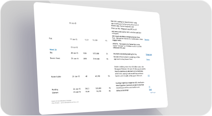 Dish CEO waiting for DirecTV/AT&T to be approved by govt before going ahead with T- 01-Jul-15 Mobile talks, Charlie Gasparino said Prior Jun 7th. Telegraph says DTE for BT and same years earlier 2013 with Dish and 2011 with sprint GM's board rebuffed a merger proposal from Fiat. GM said no interest in a combination. Both Reuters Fiat 17-Jun-15 13.51 13.330 -1% engage banks. UPDATE. Fiat expects its Ferrari SpA to be valued “at least” at 10 billion euros in an IPO 03-Jul-15 scheduled this year Week 26 Sky 20-Jun-15 1038 1073.000 3% Murdoch considering bidding for Sky Telegraph Borealis Infrastructure is weighing a £5bn Severn Trent 21-Jun-15 2055 2149.000 5% approach to buy Severn Tren Times Drahi is bidding more than 10 billion euros for Bouygues Telecom. On June 23, Bouygues said its board unanimously decided not to hold talks with Drahi, saying a sale would face antitrust Numericable 21-Jun-15 48 45.390 -5% hurdles and risk jobs at Bouygues Telecom. JJD Hunting might be a target for OCI, the Dutch- listed Egyptian chemicals conglomerate that Hunting 22-Jun-15 590.5 535.000 -9% recentlyspun off its construction arm. FT Clariant 24-Jun-15 19.44 19.370 0% Solvay to bid Sfr28 Mail 8 | P a g e Event-Driven Research Europe Alex Olvera aolvera@makorsecurities.com