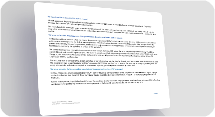 We closed our file on Sabadell/TSB (PDF on request) Sabadell announced they have received valid acceptances to their offer for TSB in excess of 90% and declare the offer fully unconditional. They further announce that a section 979 notice will go out to minorities. This means Sabadell is now legally bound to acquire the 10% not owned. The offer is still open to acceptances but TSB will stop trading /delist 28 July. We assume this is the date from which 979 notices are sent and Sabadell has 6 weeks to start the squeeze-out which should complete within 3 months. We close our file. We wrote on BG/Shell. Brazil approves. First pre condition cleared Australia next (PDF on request) The Brazilian antitrust authority CADE, has cleared the proposed acquisition of BG by Shell without restrictions. (See here) CADE approval is a pre-condition and is positive for the spread of the deal. In approving the deal without restrictions, Petrobras said that “the LNG market is global in scope, because the product is delivered by ship over long distances, and there are several countries that actively participate in this market… thus mitigates any possibility of market power exercise by the applicants as a result of this operation”. The comments are perhaps relevant in the context of the next catalyst. Australia ACCC review. The ACCC stopped taking comments today. The ACCC is expected to rule on the deal 3 September 2015. The review in Australia could look at the overlap of assets in Queensland. Shell holds a 50% interest in Arrow Energy, a joint venture with PetroChina (CNPC). BG has an interest in an LNG plant on Curtis Island (QCLNG Project) with China National Offshore Oil Corporation (CNOOC) and Tokyo Gas. The ACCC may look at complaints that there is a shortage of gas in Queensland and that allowing the deal could lead to higher prices for Australian gas users. The ACCC review may be significant also for China’s companies CNPC/CNOOC and therefore for Mofcom. The ACCC may be looking at preserving prices and supply into Australia while Mofcom may look at issues around exporting gas and maybe the stakes held by CNPC/CNOOC. We wrote on Anite. Earlier completion expected and Korea approval received. (PDF on request) Keysight released the scheme document this week. We learned that one of the key conditions to deal completion has been received.On July 1st, Keysight received notification from Korea Fair Trade Commission that the Acquisition does not violate Article 7, Paragraph 1 of the Monopoly Regulation and Fair Trade Law. For this reason perhaps, Keysight has brought forward the completion date by two months. Keysight expects completion by the end August 2015 (before they said October).The pending key condition now is voting approval at the General & Court Meeting that will take place 30 July 2015. 4 | P a g e Event-Driven Research Europe Alex Olvera aolvera@makorsecurities.com