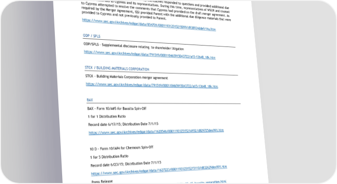 MAKOR EVENT DRIVEN MORNING COMMENTS th June 8 2015 NEWS NORTH AMERICA: ISSI / SUMMIVIEW ISSI/Summitview - Supplemental Proxy Materials From May 31 to June 4, 2015, ISSI and its representatives responded to questions and provided additional due diligence materials to Cypress and its representatives. During this time, representatives of WSGR and counsel to Cypress attempted to resolve the comments that Cypress had provided on the draft merger agreement. As required by the Merger Agreement, ISSI provided Parent with the additional due diligence materials that were provided to Cypress and not previously provided to Parent. https://www.sec.gov/Archives/edgar/data/854701/000119312515215099/d938934ddefr14a.htm ODP / SPLS ODP/SPLS – Supplemental disclosure relating to shareholder litigation https://www.sec.gov/Archives/edgar/data/791519/000110465915043722/a15-13648_18k.htm STCK / BUILDING MATERIALS CORPORATION STCK – Building Materials Corporation merger agreement https://www.sec.gov/Archives/edgar/data/791519/000110465915043722/a15-13648_18k.htm BAX BAX – Form 10/A#5 for Baxalta Spin-Off 1 for 1 Distribution Ratio Record date 6/17/15; Distribution Date 7/1/15 https://www.sec.gov/Archives/edgar/data/1620546/000119312515214952/d829725dex991.htm 10 D – Form 10/A#4 for Chemours Spin-Off 1 for 5 Distribution Ratio Record date 6/23/15; Distribution Date 7/1/15 https://www.sec.gov/Archives/edgar/data/1627223/000119312515215110/d832629dex991.htm Press Release http://www.baxter.com/press_room/press_releases/2015/06_05_15_baxalta_separation.html April 15, 2015 4