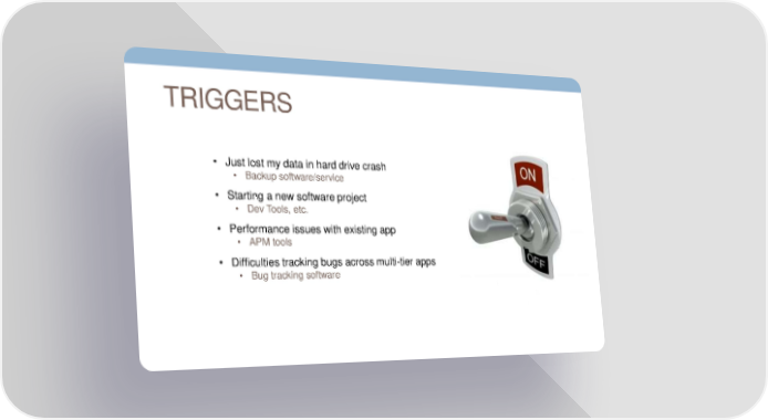 TRIGGERS • Just lost my data in hard drive crash • Backup software/service • Starting a new software project • Dev Tools, etc. • Performance issues with existing app • APM tools • Difficulties tracking bugs across multi-tier apps • Bug tracking software