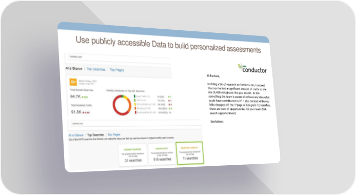 Use publicly accessible Data to build personalized assessments Hi Barbara, In doing a bit of research on fortinet.com, I noticed that you’ve lost a significant amount of traffic to the site (4,400 visits) over the past month. Is this something the team is aware of or have any idea what could have contributed to it? I also noticed while you folks dropped off the 1stpage of Google in 11 searches, there are tons of opportunities for your team (916 search opportunities!) See below: