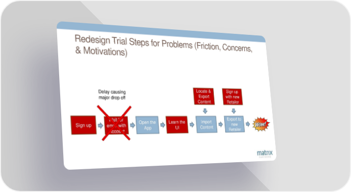 Redesign Trial Steps for Problems (Friction, Concerns, & Motivations) Delay causing Locate & Sign up major drop off Export with new Content Retailer Wait for Open the Learn the Import Export to Sign up email with App UI Content new Account Retailer