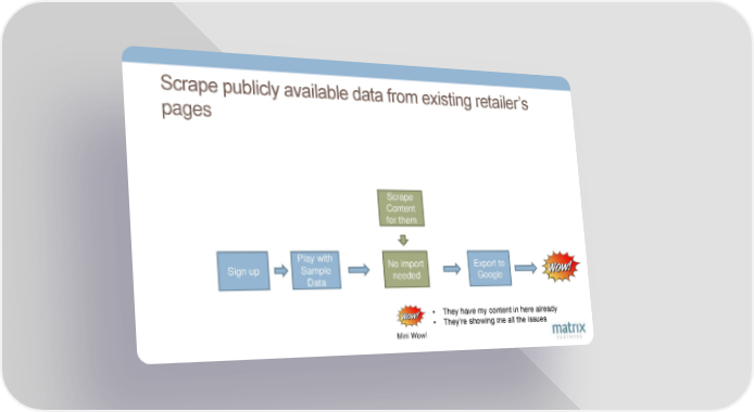 Scrape publicly available data from existing retailer’s pages Scrape Content for them Play with No import Export to Sign up Sample needed Google Data • They have my content in here already • They’re showing me all the issues Mini Wow!