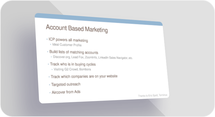Account Based Marketing • ICP powers all marketing • Ideal Customer Profile • Build lists of matching accounts • Discover.org, Lead Fox, ZoomInfo, LinkedIn Sales Navigator, etc. • Track who is in buying cycles • Visiting G2 Crowd, Bombora • Track which companies are on your website • Targeted outreach • Aircover from Ads Thanks to Eric Spett, Terminus