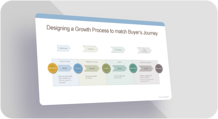 Designing a Growth Process to match Buyer’s Journey Awareness Interest Purchase Post Purchase Top of Funnel Middle of Funnel Sales Customer Success Strangers Attract Visitors Convert Leads Close Customers Delight Promoters Drive the right traffic Convert raw leads Convert MQLs into Onboard, support and that matches your into MQLs closed deals ensure customer ICP and convert to success as measured by raw leads a customer KPI Credit: HubSpot