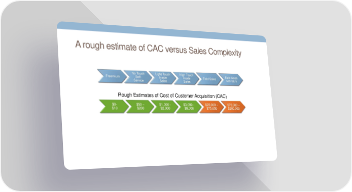 A rough estimate of CAC versus Sales Complexity No Touch Light Touch High Touch Field Sales Freemium Self- Inside Inside Field Sales Service Sales Sales with SE’s Rough Estimates of Cost of Customer Acquisition (CAC) $0- $50 – $1,000 - $3,000 - $25,000 – $75,000 – $10 $200 $2,000 $8,000 $75,000 $200,000