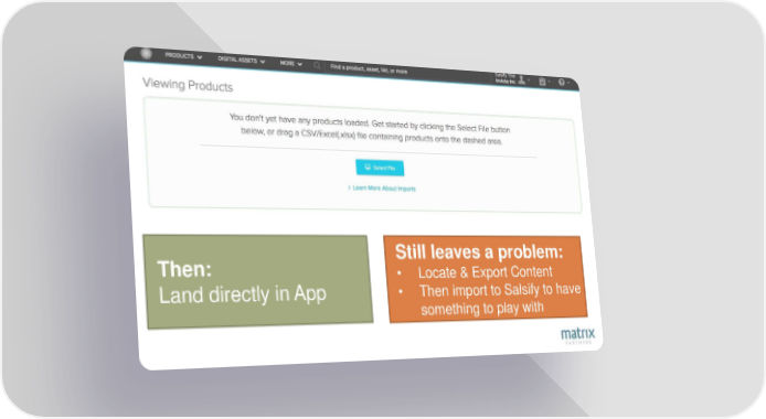 Then: Still leaves a problem: • Locate & Export Content Land directly in App • Then import to Salsify to have something to play with