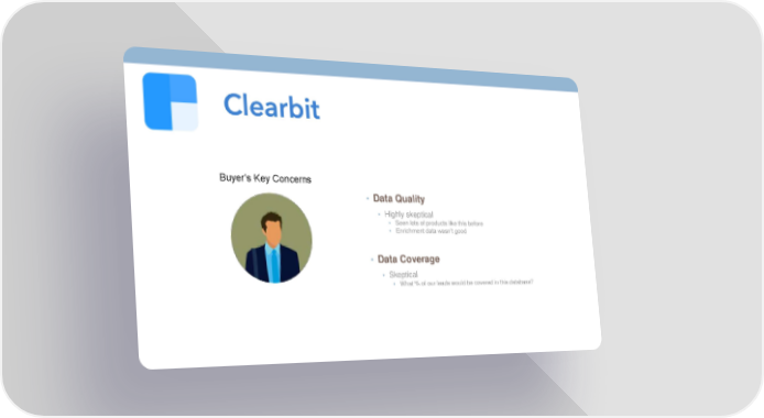 CLEARBIT Buyer’s Key Concerns • Data Quality • Highly skeptical • Seen lots of products like this before • Enrichment data wasn’t good • Data Coverage • Skeptical • What % of our leads would be covered in this database?