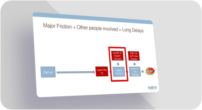 Major Friction + Other people involved = Long Delays Locate & Sign up Export with new Content Retailer Sign up Learn the Import Export to UI Content new Retailer