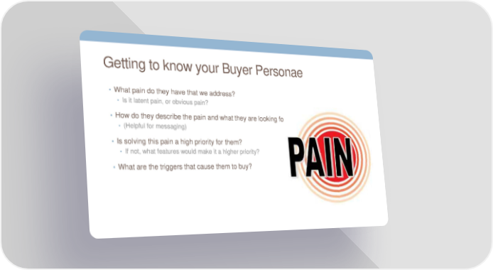 Getting to know your Buyer Personae • What pain do they have that we address? • Is it latent pain, or obvious pain? • How do they describe the pain and what they are looking for? • (Helpful for messaging) • Is solving this pain a high priority for them? • If not, what features would make it a higher priority? • What are the triggers that cause them to buy?