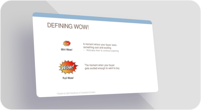DEFINING WOW! A moment where your buyer sees something cool and exciting Mini Wow! • Motivates them to continue exploring The moment when your buyer gets excited enough to want to buy Full Wow! Thanks to Gail Goodman of Constant Contact