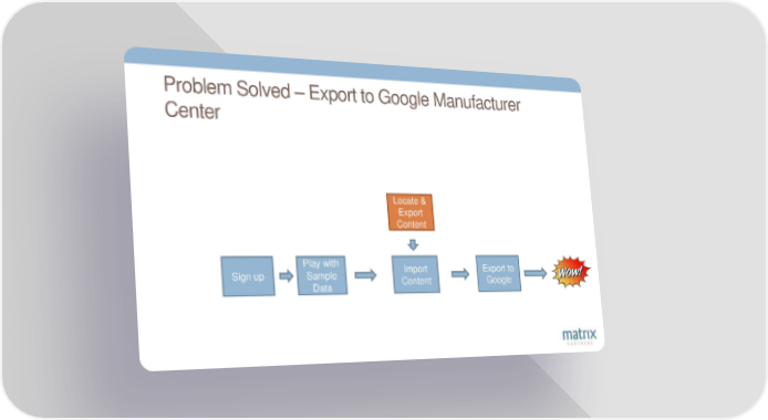 Problem Solved –Export to Google Manufacturer Center Locate & Export Content Play with Import Export to Sign up Sample Content Google Data