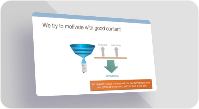 [Get Inside Your Buyers Head] Page 50 Page 52We try to motivate with good content FRICTION CONCERNS MOTIVATIONS But frequently irritate the buyer with the barrier that stops them from getting at the content, and lose them at that step